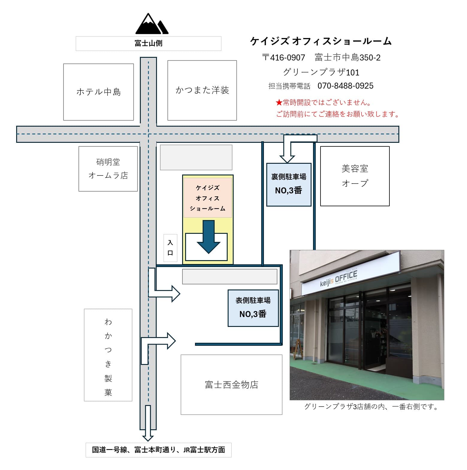 <商談室兼ショールーム> 〒416-0907 富士市中島350-2 グリーンプラザ 1F 101店舗(専用駐車場有) 電話 0545-88-0925 FAX 0545-88-9291 見学の場合は事前にご連絡下さい。(常時開設ではございません)