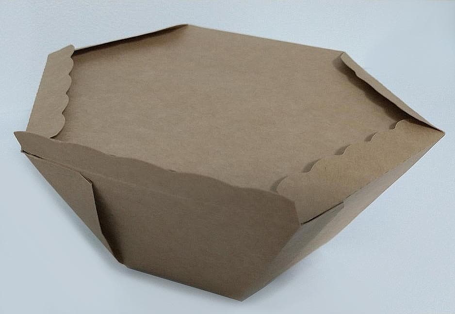 2021年10月より店頭販売が開始されるサラダ専門店の容器として採用。現在都内で7店舗を運営されている。昨今のダイエットブームやコロナ禍で男性のダイエット志向も高まり売上を伸ばしている。そのチェーン店舗の代表より依頼を請け元々ストックされていた考案をこの案件より具現化した容器。店内でサラダに様々な食材をトッピングしドレッシングを投入して混ぜる際に店内のポール容器を利用してそれをプラスチック容器に移し包装販売していた。その店内ボールを都度洗浄していた手間をこの紙容器でその洗浄工程を省き、この容器で混ぜ作業することにより社内オペレーション作業を軽減、脱ブラを達成させた。容器の接着には糊剤も利用せず熱によるヒートシールとなっており環境配慮。一般的な市販容器では上部230mm,高さ110mmHのビックサイズを6角形ウオータータイドタイプは市場で販売されていない。紙材は150kgでこのサイズからは非常に薄いのですが、形式により強度を増して紙材の重量軽減をしてゴミ量軽減も果たしている。またヒートシールしている角を外して開くと上部が広がりテーブルでの大皿的な利用も促せる。世に初めて発売される容器となる。今後は様々な食材に向けての脱ブラ紙容器として確立して行きたい。