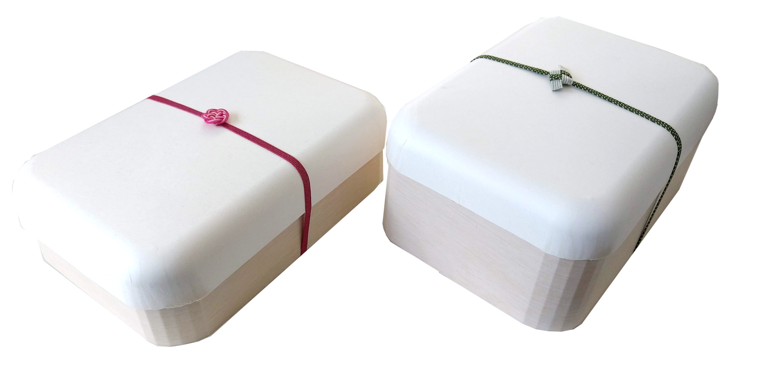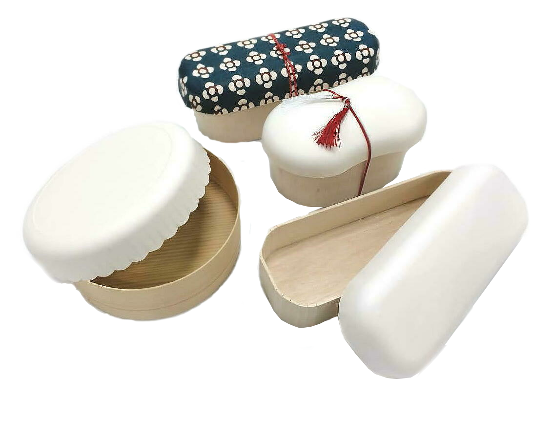 紙製の深絞り加工を施したフタに木製(ファルカタ材)の本体を装着させたパッケージ。紙製だけのパッケージでは表現できない部分を木の風合いを加味させ、フタが紙製のため多彩な印刷表現が施せる。木製のお弁当用、および和風系の用途から洋風食材などのさまざまなパッケージに使用用途を広げる表現を持たせた。特に紙フタは技術開発している板紙を深く絞る加工技術により、フタとしてのプロダクト機能が生まれる。また、フタの縁部分にさまざまなカッティングを施して独自性のあるプロダクト表現が可能。そのラインにより雰囲気が変わる。本体はワッパ、折箱などを製造する木製容器業界への協力依頼パッケージ(板紙名 KGボード7) 本体も環境配慮のファルカタ材。