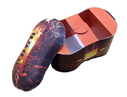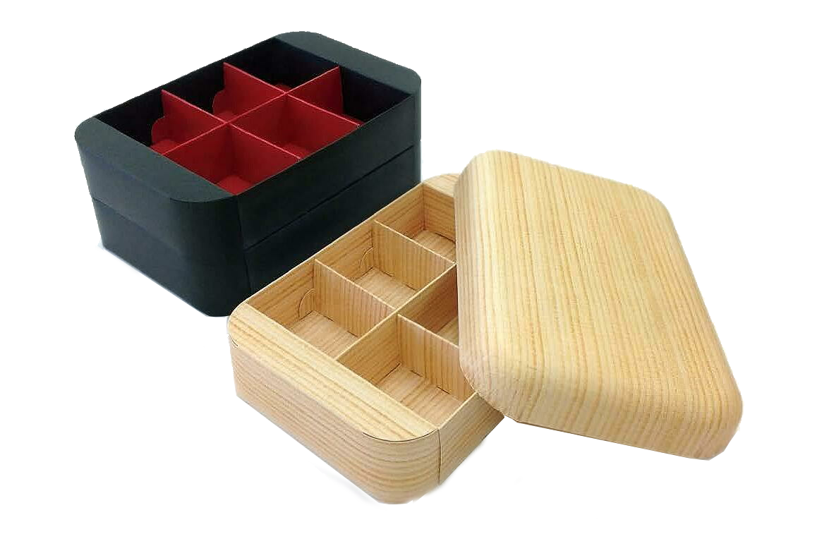 絞り成形プレス加工パッケージをフタとして利用するプロダクト。熱成形プレスの難点であるサイズ調整に対する金型代がコスト高なため、サイズ種類を増やすことが容易でない点を本体製品側のみ通常の比較的安価なトムソン抜き型にて設計製造する。本体が組箱トムソン型となるため、仕切り等あらゆる商品サイズ、その他、目的に合わせたプロダクト設計が可能となる。特徴はフタの角R感を全面に表現できる今までに無かったパッケージプロダクトとなった。専用の食品トレーを本体側に設置することにより、直接食材を入れることも可能となる。菓子向けから付加価値ギフトへ今までに無いパッケージ表現を提供する。