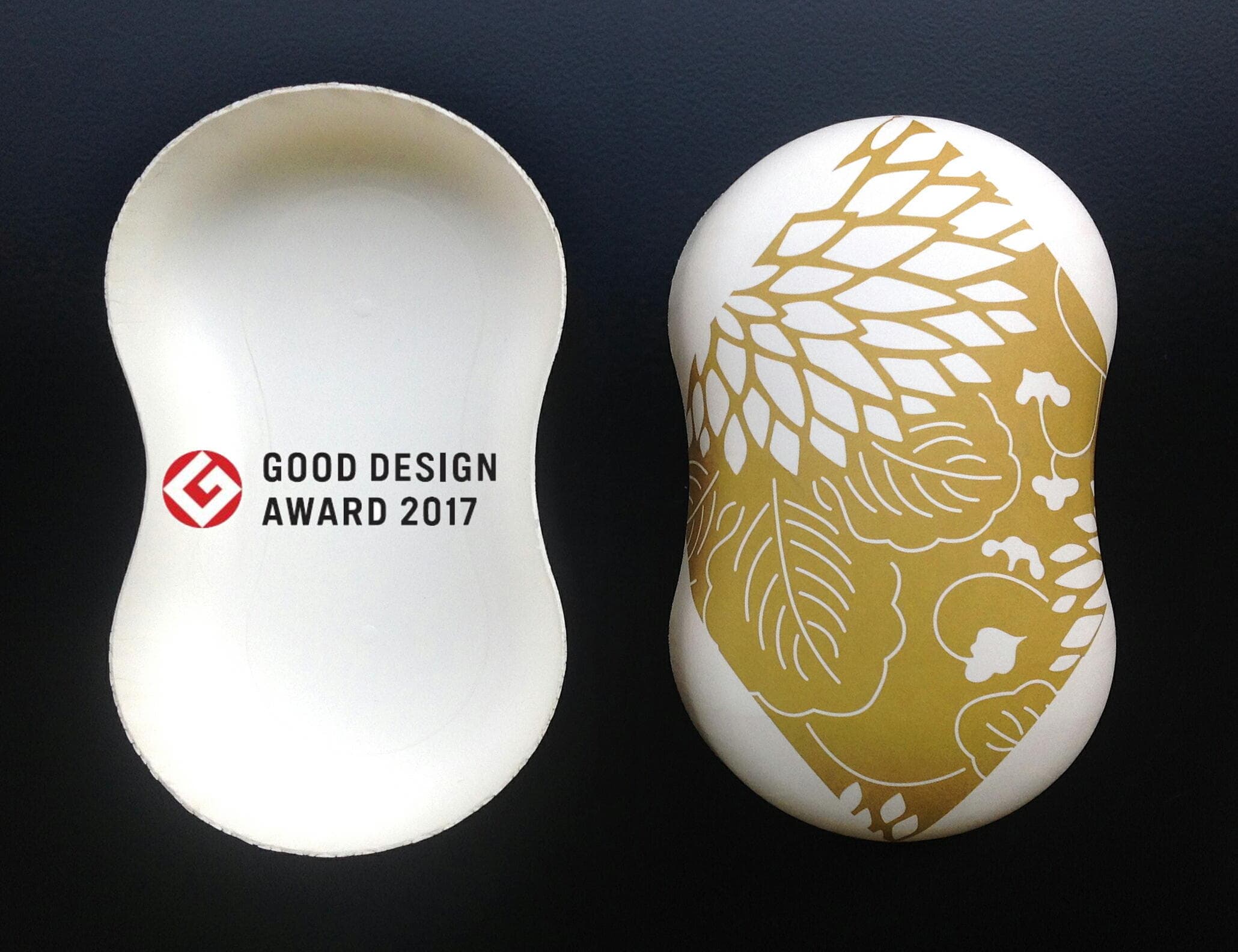 まゆ玉型の容器。フタと本体の1セット。型はNO,1~NO3、NO,3大 まで4型保有。NO,1はよりウエストが絞られ、NO,3になるにしたがいより膨らんだ型となる。熱絞り容器の型の中でも絞り度が高く非常に難しい製法となる。ラウンドした形がやさしさを表現する。2017年度グッドデザイン賞受賞はNO,3。