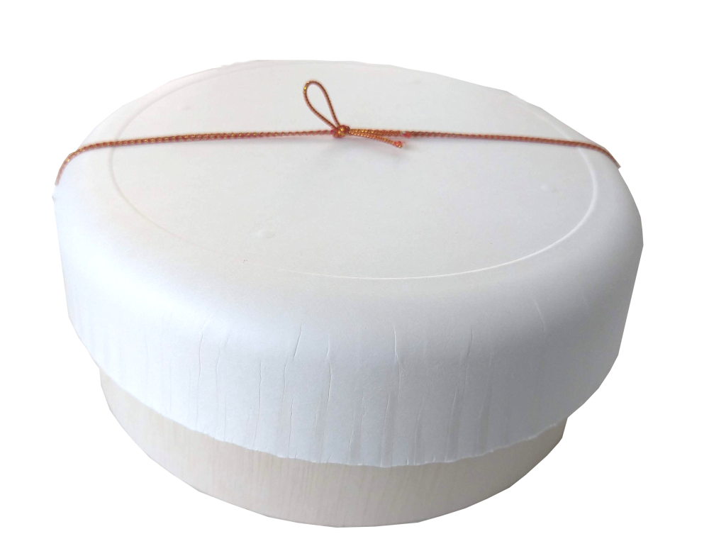 紙製の深絞り加工を施したフタに紙製組箱本体を装着させたパッケージ。熱絞り成形用の金型だけの寸法では表現できない部分を板紙の組箱形式にて多彩なサイズ、商品の仕切り化が施せる。和風系の菓子、食材用途から洋風菓子系などのさまざまなパッケージに使用用途を広げる表現を持たせた。